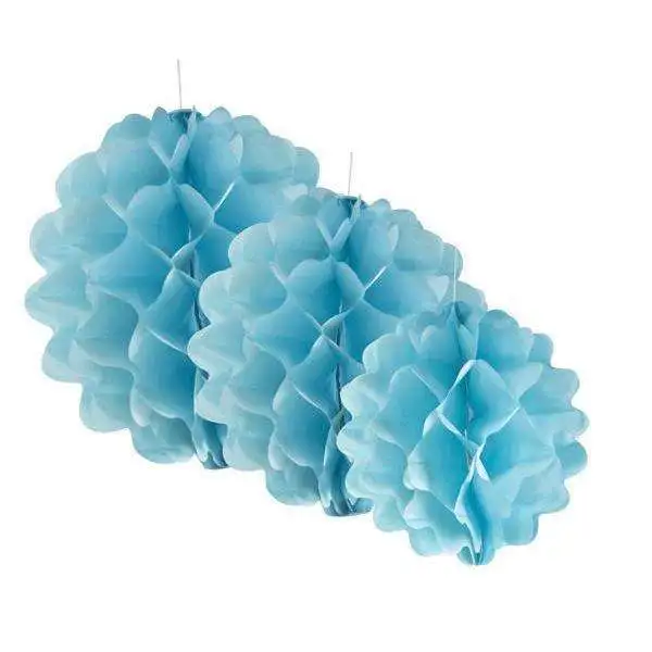 Ces boules en papier alvéolé bleu à suspendre mesurent 15, 20 et 29 cm de diamètre.