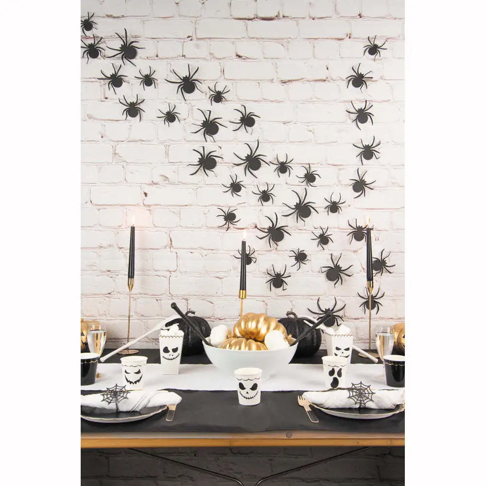 Ce sachet contient 35 araignées noires effet 3D, de 3 tailles différentes (dimension max 15 x 15,5 cm). La gomme adhésive repositionnable est incluse.