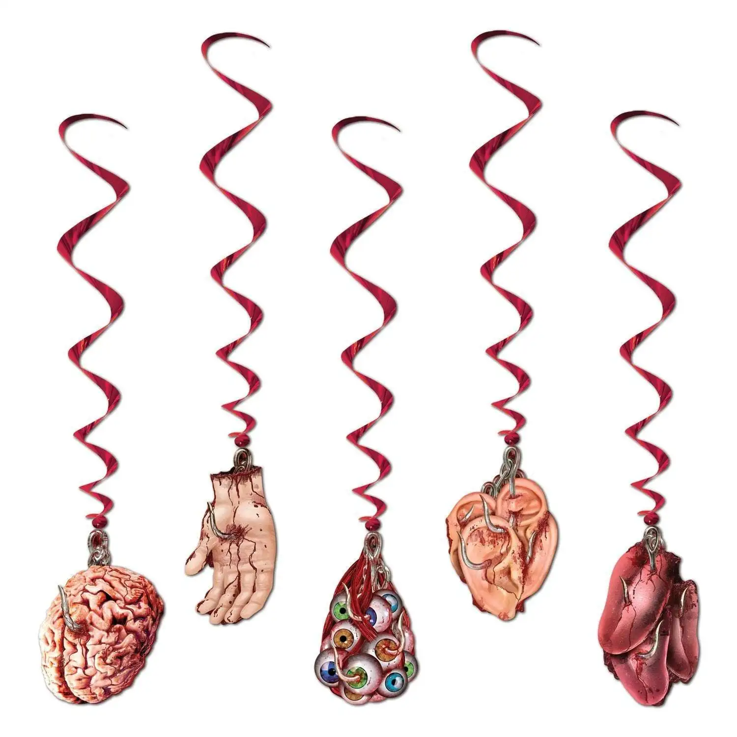 Sachet de 5 suspensions, représentant des parties du corps ensanglantées. Environ 1m de longueur.