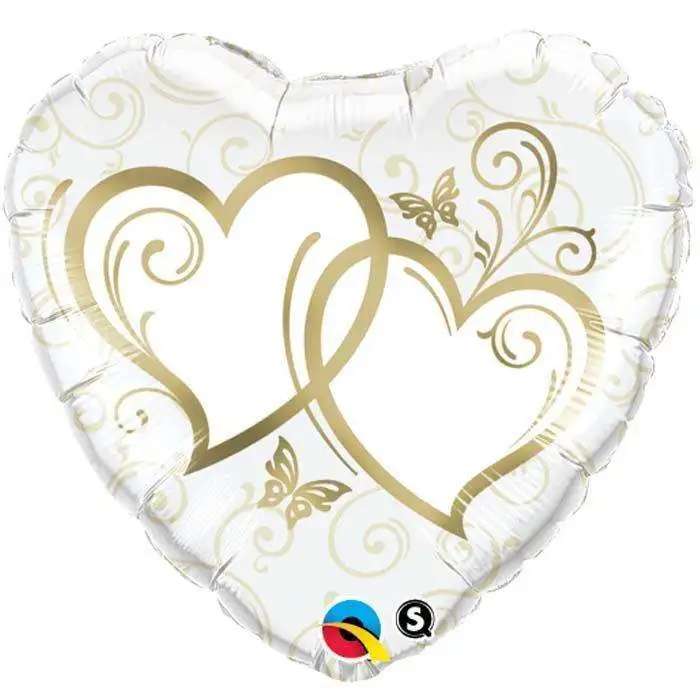 Ce ballon en aluminium est en forme de coeur blanc et or. Il représente deux coeurs dorés entrelacés, entourés de volutes et de papillons. Il est adapté au gonflage à l’air ou à l’hélium. Il est livré non gonflé.