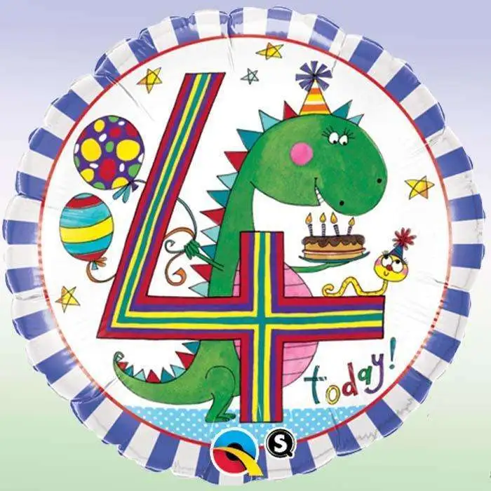 Ce ballon en aluminium est imprimé du chiffre 4, illustré d’un dinosaure, d’un gâteau d’anniversaire et de ballons. Il est adapté au gonflage à l’air ou à l’hélium. Il est livré non gonflé.