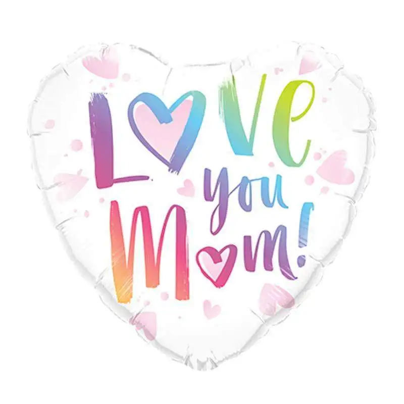 Ce ballon en aluminium est en forme de coeur blanc. Une inscription pastel “Love You Mom”, ainsi que des petits coeurs, recouvrent toute la surface du ballon. Il est adapté au gonflage à l’air ou à l’hélium.