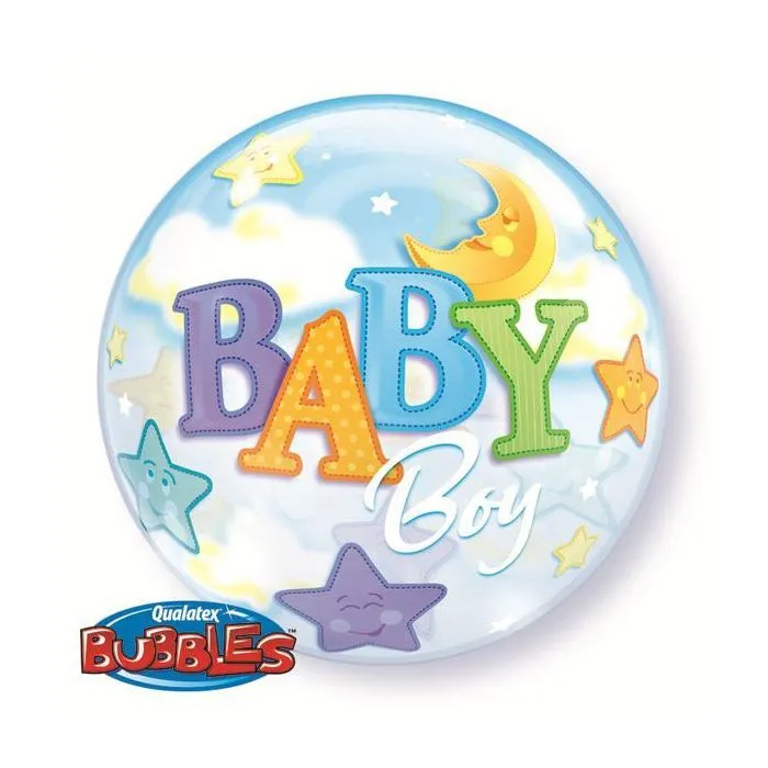 Ce ballon Bubble en plastique étirable est couvert de lune, de nuages et d’étoiles, entourant les mots “Baby Boy”. Il est adapté au gonflage à l’air ou à l’hélium.