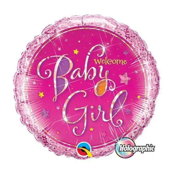 Ce ballon holographique en aluminium est de couleur rose. L’inscription ” Welcome Baby Girl” se trouve au centre du ballon, écrit en lettres multicolores. Il est adapté au gonflage à l’air ou à l’hélium.