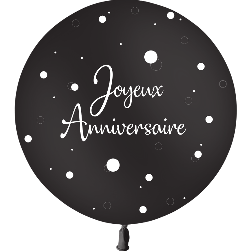 Ce ballon en latex naturel est noir, imprimé de pois et de confettis blancs, ainsi que de la phrase “Joyeux Anniversaire“. Il est adapté au gonflage à l’air et à l’hélium.