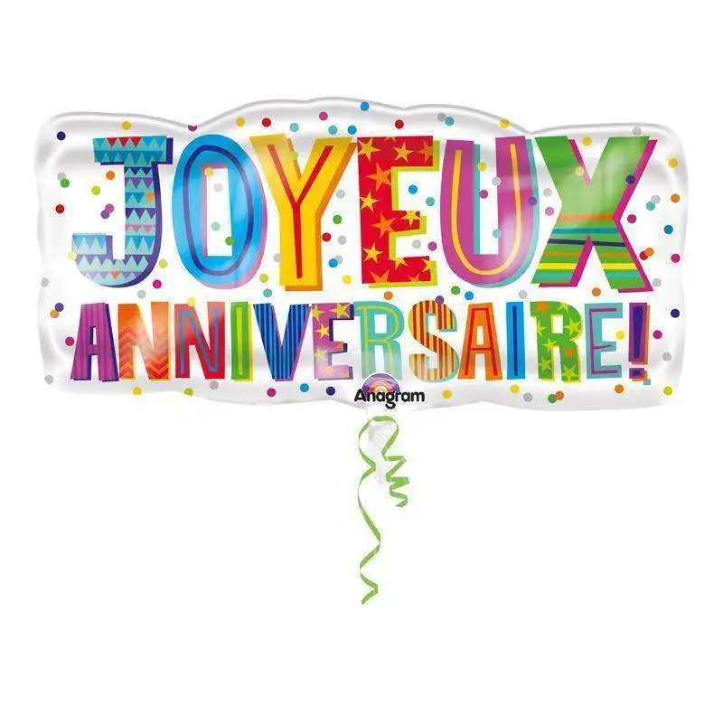 Ce ballon en aluminium “Joyeux Anniversaire” mesure 83 x 40 cm. Il pourra être gonflé à l’air ou à l’hélium.
