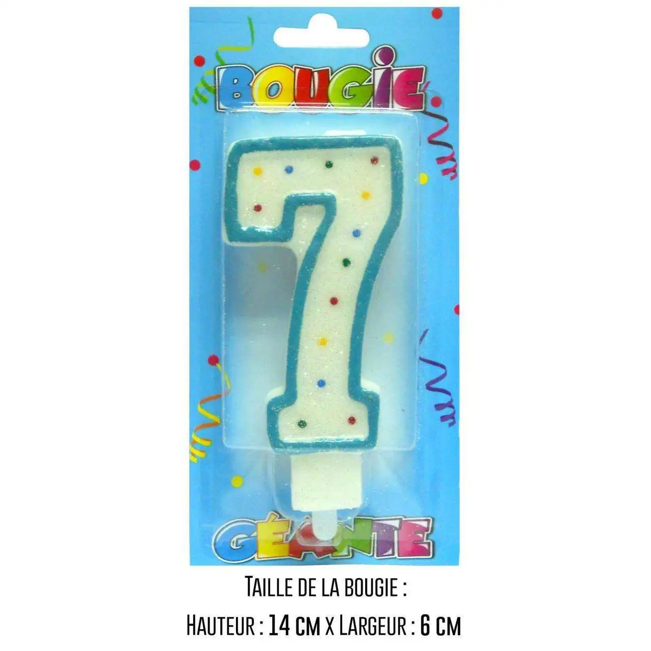 Cette bougie géante pailletée chiffre 7 sera parfaite utilisée seule, ou accompagnée d’un autre chiffre. Elle mesure 14 x 6 cm.