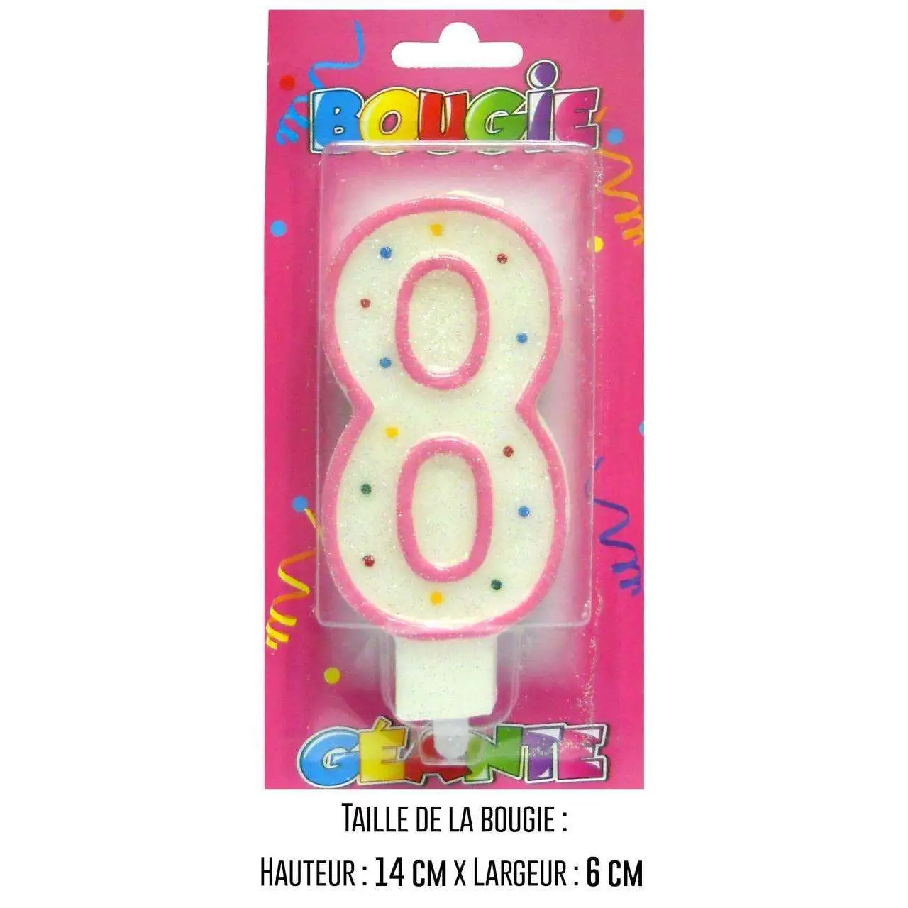 Cette bougie géante pailletée chiffre 8 sera parfaite utilisée seule, ou accompagnée d’un autre chiffre. Elle mesure 14 x 6 cm.