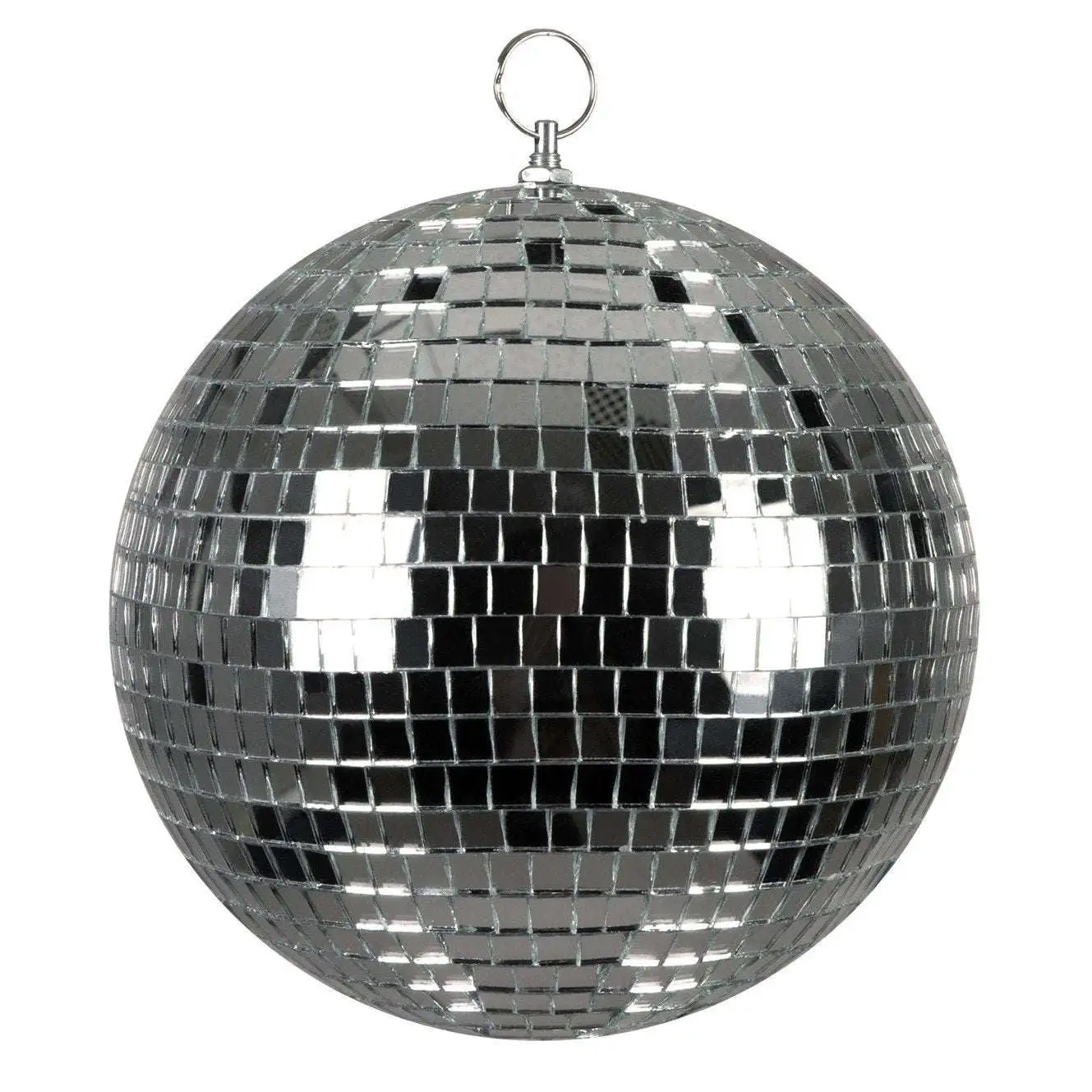 Cette boule à facette argentée mesure 20 cm de diamètre.