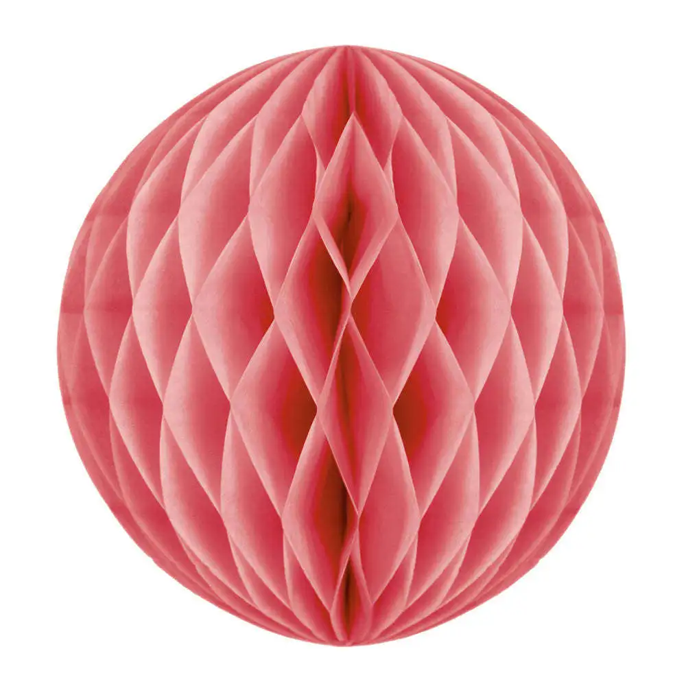 Cette boule alvéolée corail en papier de soie mesure 20 cm de diamètre.