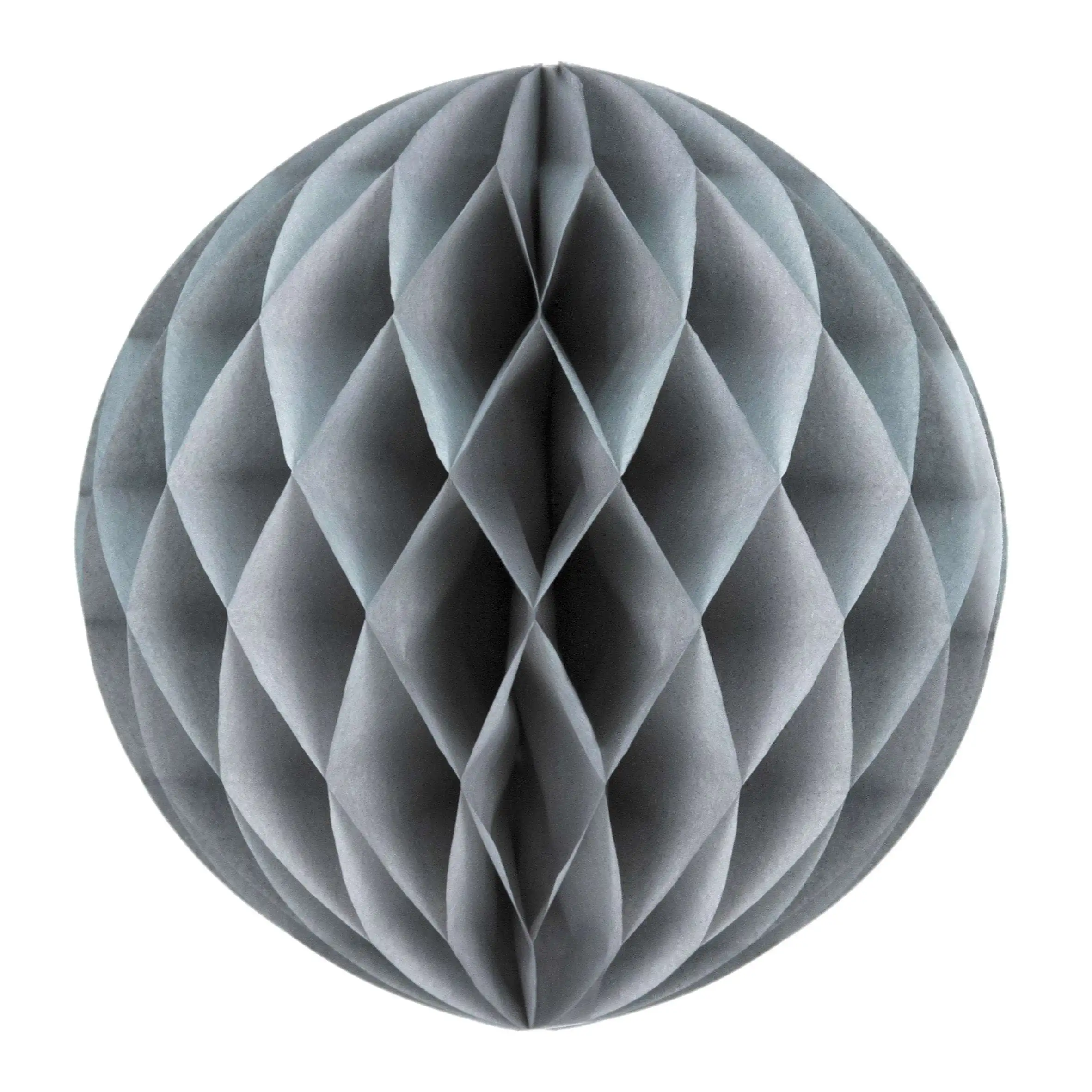 Cette boule alvéolée grise en papier de soie mesure 20 cm de diamètre.