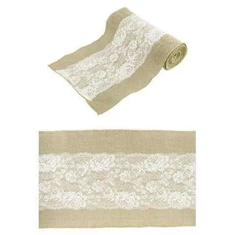 En jute naturelle, il est décoré d’une bande de dentelle blanche.