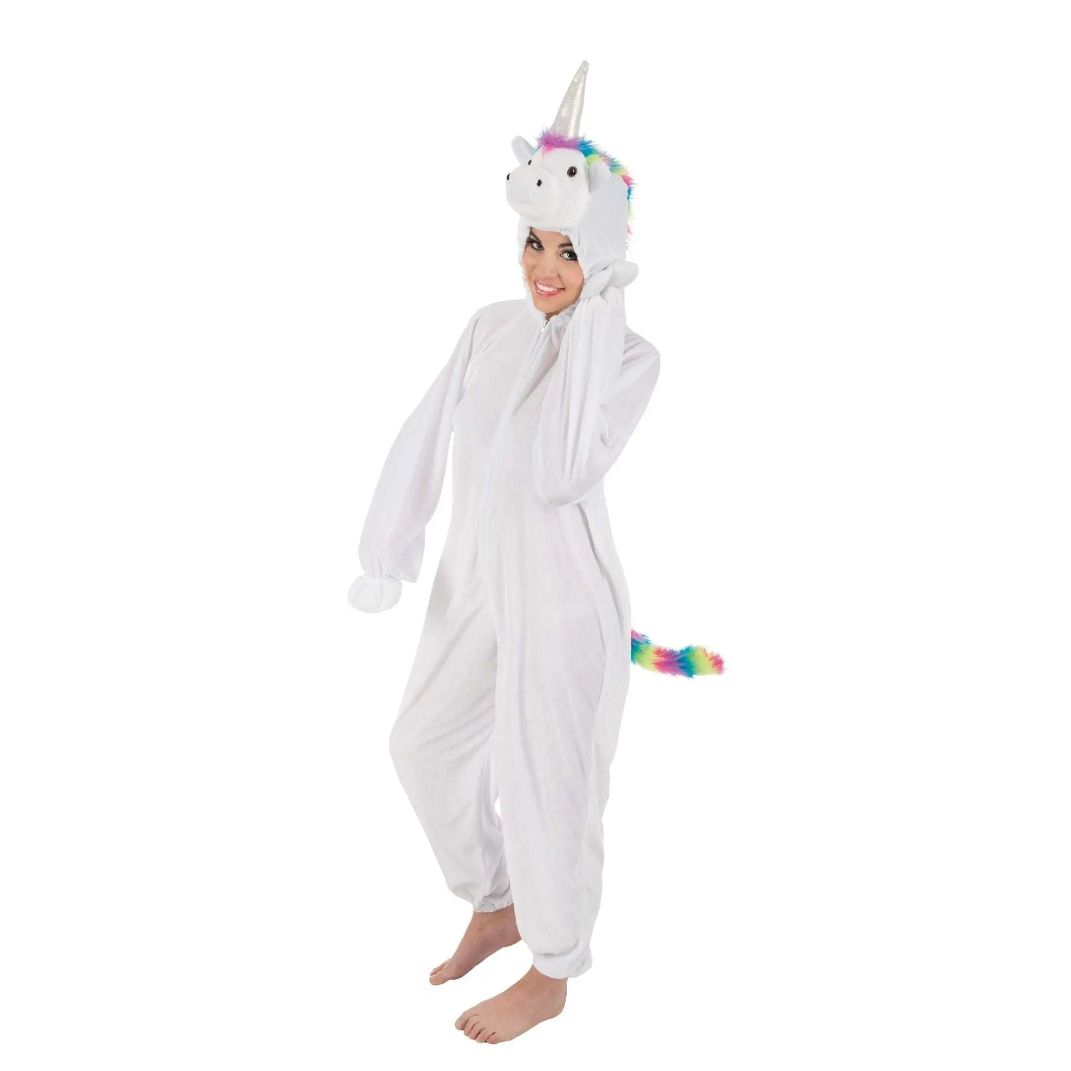 Ce costume de licorne blanche pour adulte se compose d’une combinaison à capuche. Il est disponible en taille 164 cm ou 180 cm.