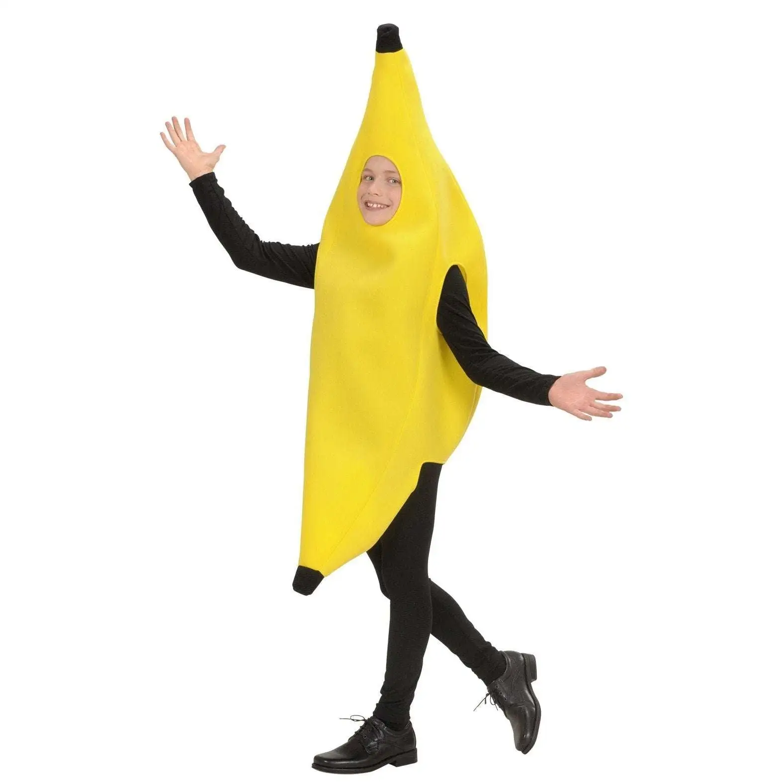 Costume de banane pour enfant se présentant sous forme de combinaison (justaucorps non inclus). Taille 128 cm, 140 cm ou 158 cm.