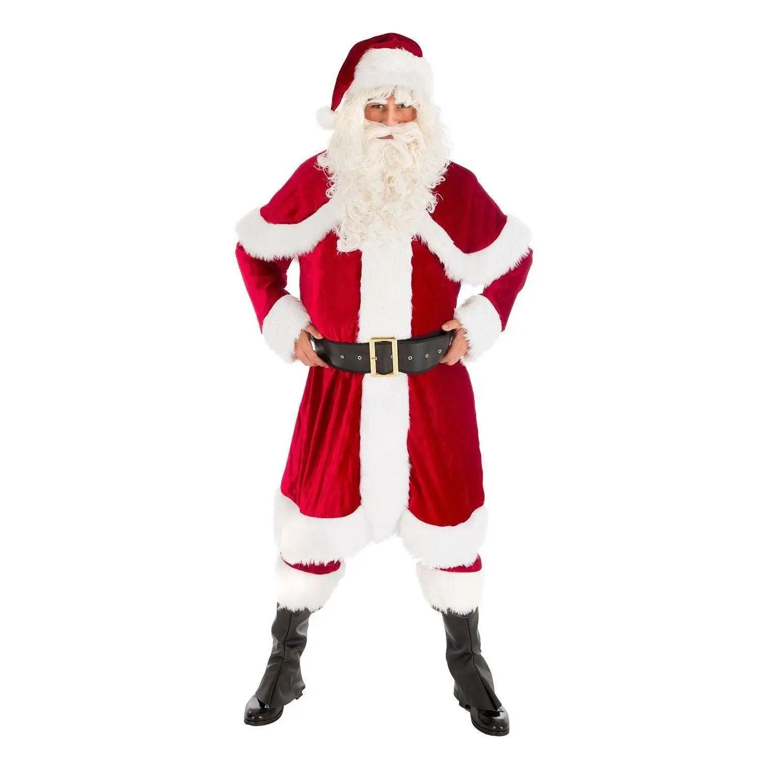 Déguisement haut de gamme de père noël en velours comprenant une veste, un pantalon, une ceinture, un bonnet et les surbottes. Disponible en taille L ou XL.