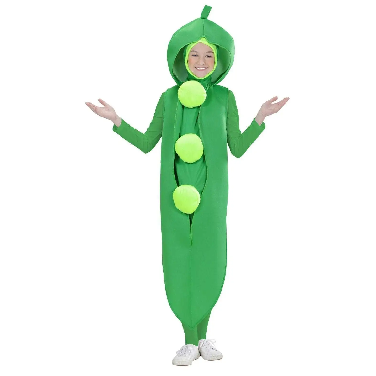 Costume de petit pois pour enfant se présentant sous forme de combinaison (justaucorps non inclus). Taille 128 cm, 140 cm ou 158 cm.