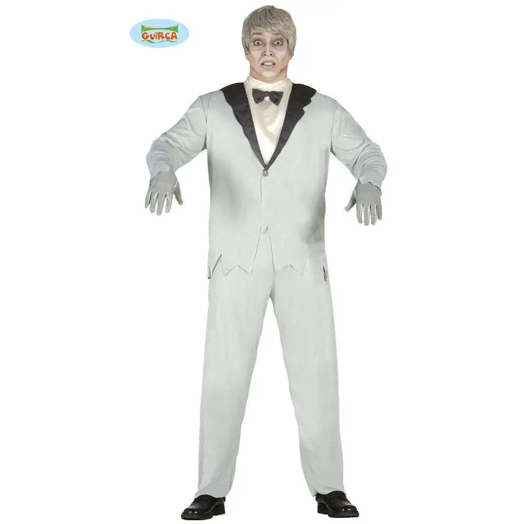 Costume de fiancé fantôme comprenant une veste avec chemise, un noeud papillon et un pantalon.