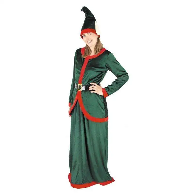Ce costume de lutin de Noël pour femmes se compose d’un bonnet avec oreilles, d’une longue veste en velours, d’une jupe élastique à la taille et d’une ceinture.