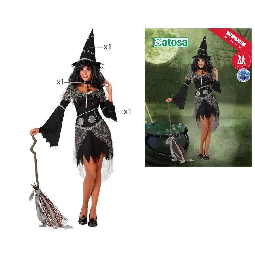 Déguisement de sorcière noir et dentelle grise, comprenant la robe et le chapeau.