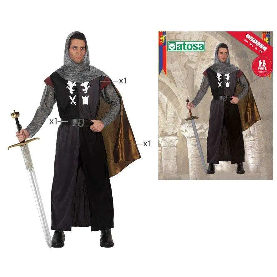 Déguisement de chevalier médiéval comprenant une cagoule, une cape, une tunique et une ceinture.