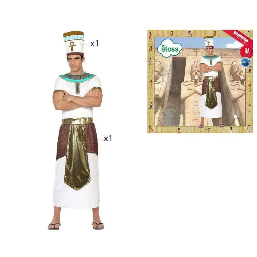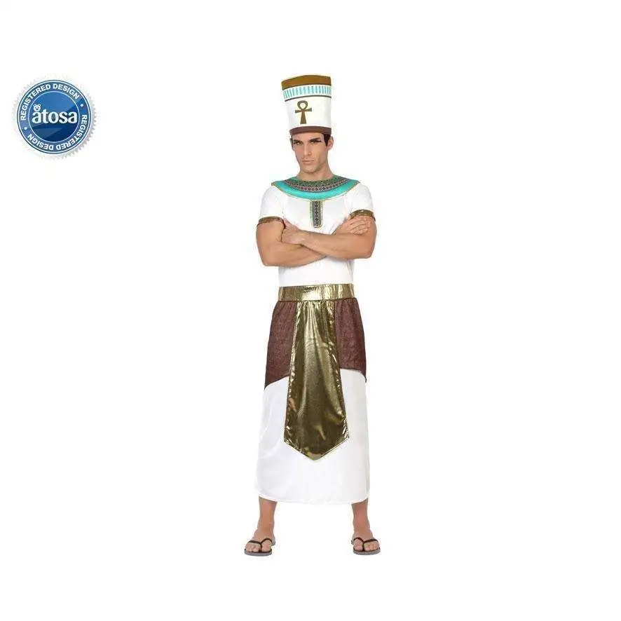 Ce déguisement de pharaon égyptien pour homme comprend une robe complète avec ceinture et collier, ainsi qu’une coiffe. Disponible en taille T2 (M/L) et T3 (XL).