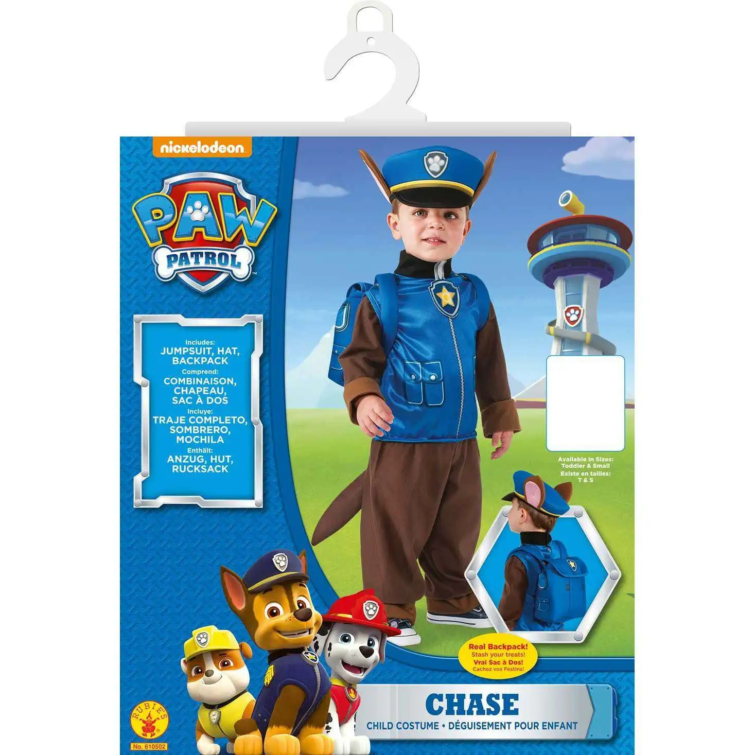 Ce déguisement luxe de Chase pour enfants, sous licence officielle Pat’Patrouille™, se compose d’une combinaison, d’une casquette et d’un sac à dos. Il est disponible en taille S (3/4 ans).