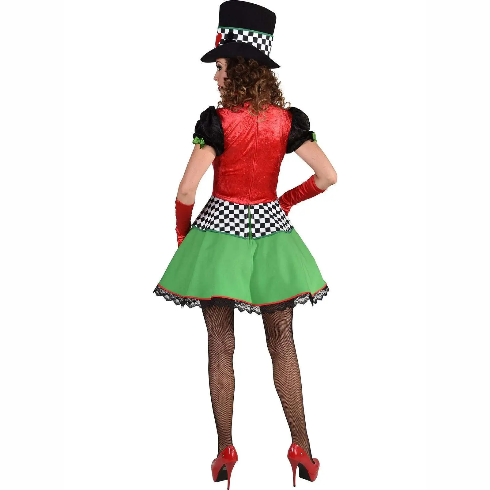 Le bas de la robe est vert, décoré d’enseignes / de motifs de cartes (trefles, carreaux, coeur et piques). Un liseré de dentelle magnifie la tenue.