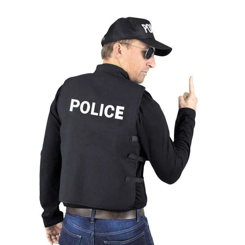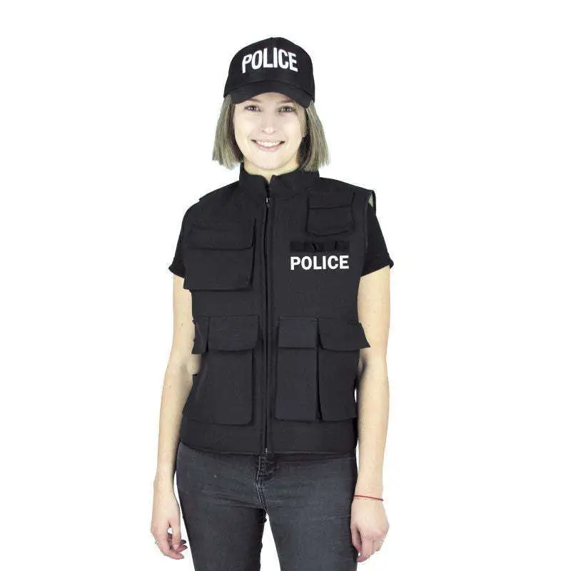 Il est noir et rembourré sur le torse. Le mot Police y est imprimé en blanc sur le buste et dans le dos. De nombreuses poches vous permettront d’y ranger vos accessoires.