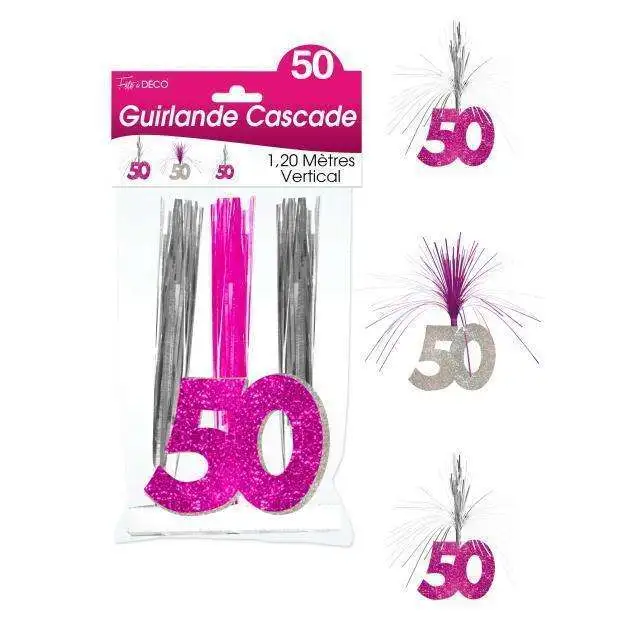 Apportez modernité et festivité avec la guirlande cascade anniversaire 50 ans de couleur rose et argent avec effet hologramme.