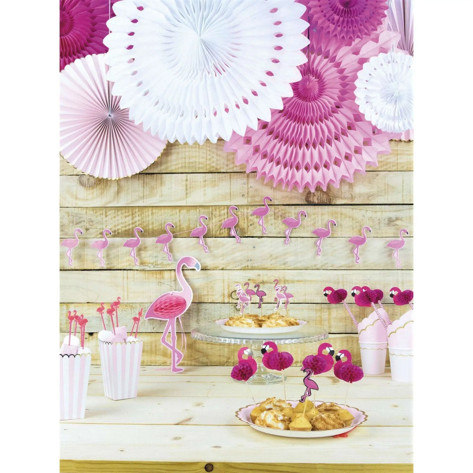 Cette guirlande en carton se compose de flamants roses. Elle mesure 3 mètres de long et chaque motif mesure 14 cm environ.