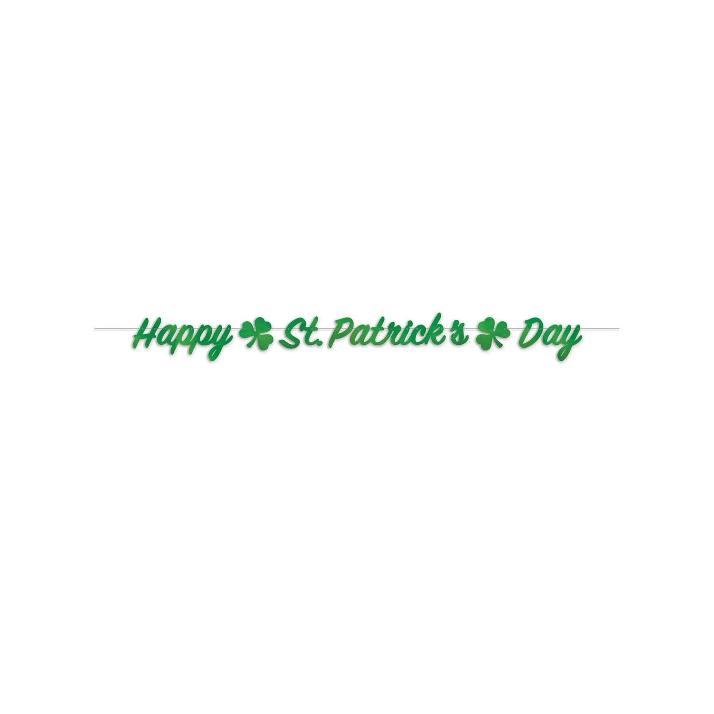 Elle affiche la phrase Happy St Patrick’s Day en lettres vertes. Deux trèfles s’ajoutent à cette bannière.