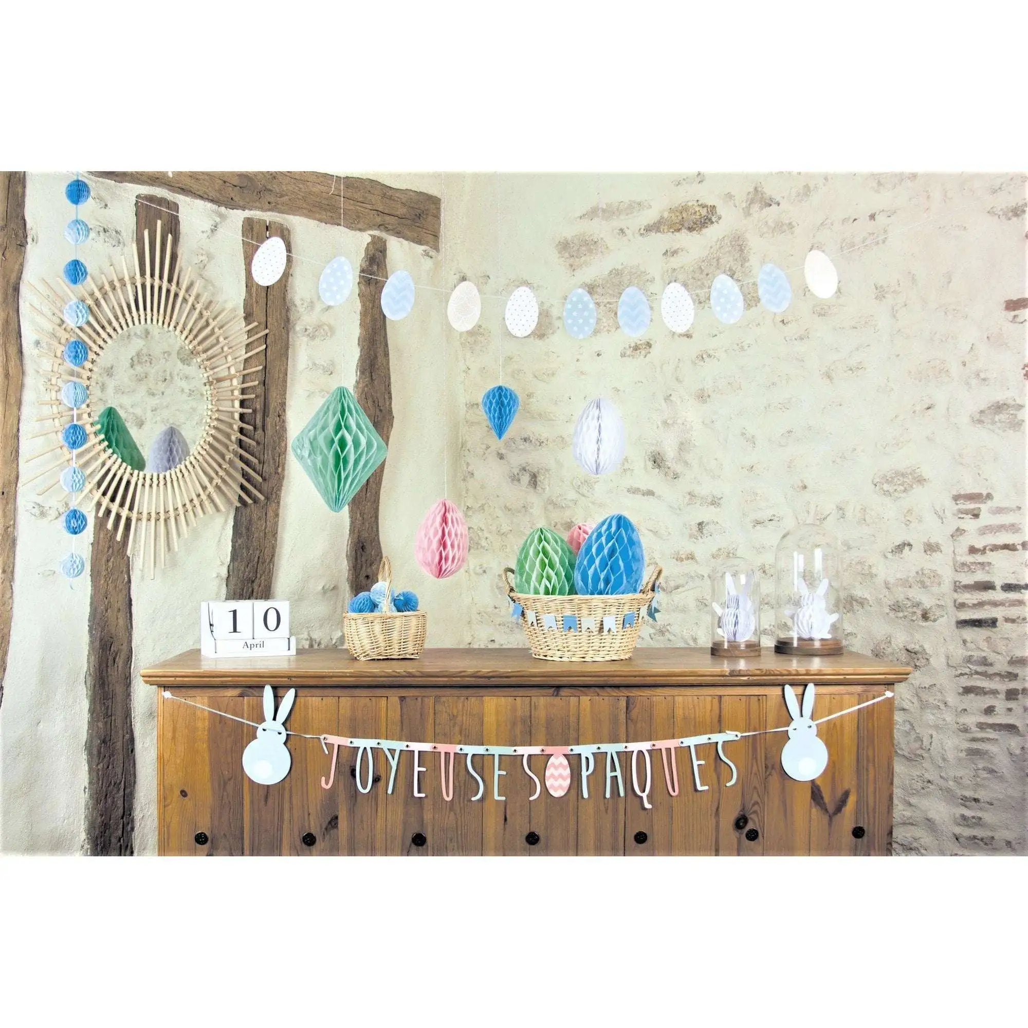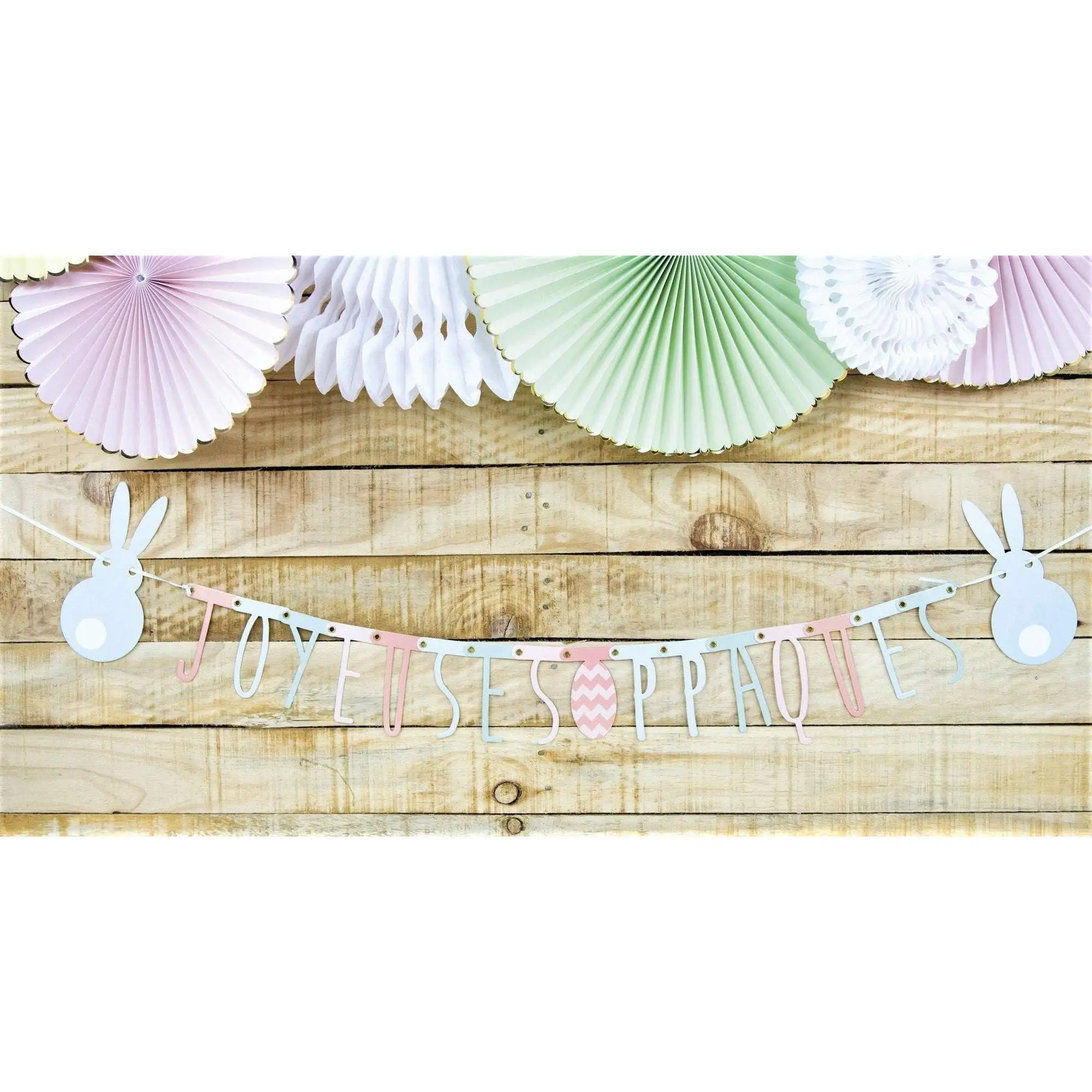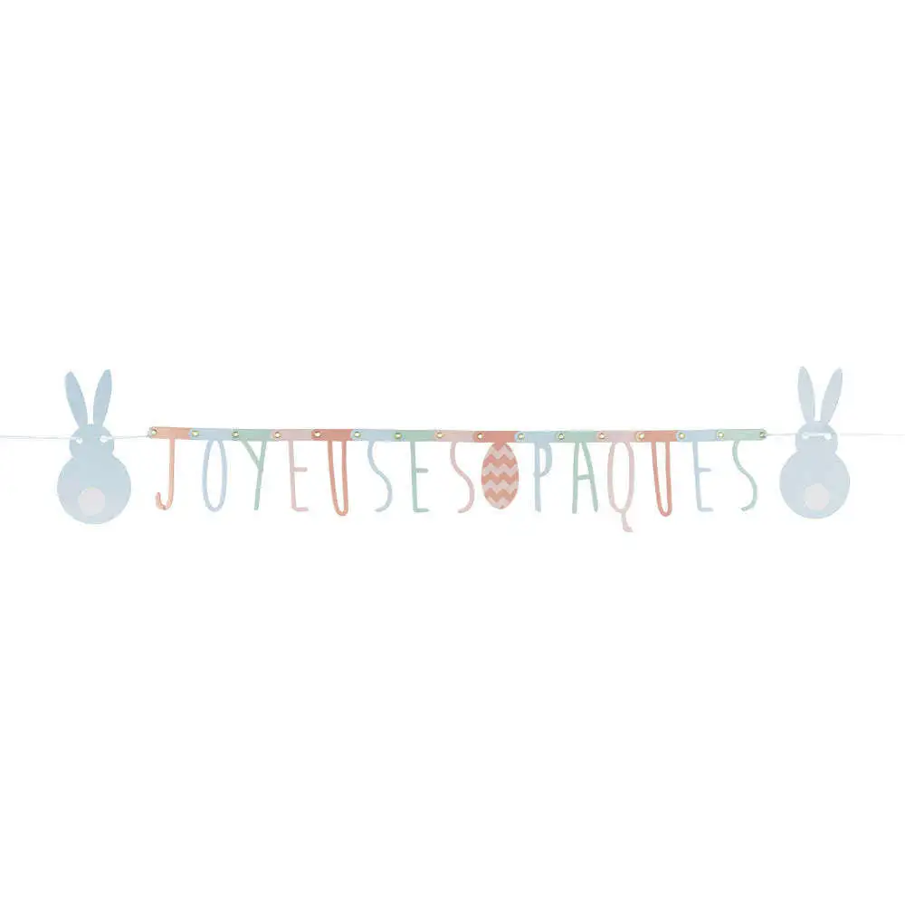 Les lettres pastel de cette guirlande en carton forment les mots “Joyeuses Pâques“. Elle mesure 1.60 mètres de long et chaque lettre mesure 10 cm environ.
