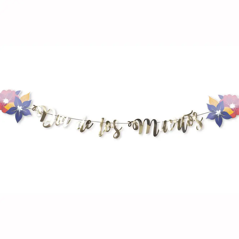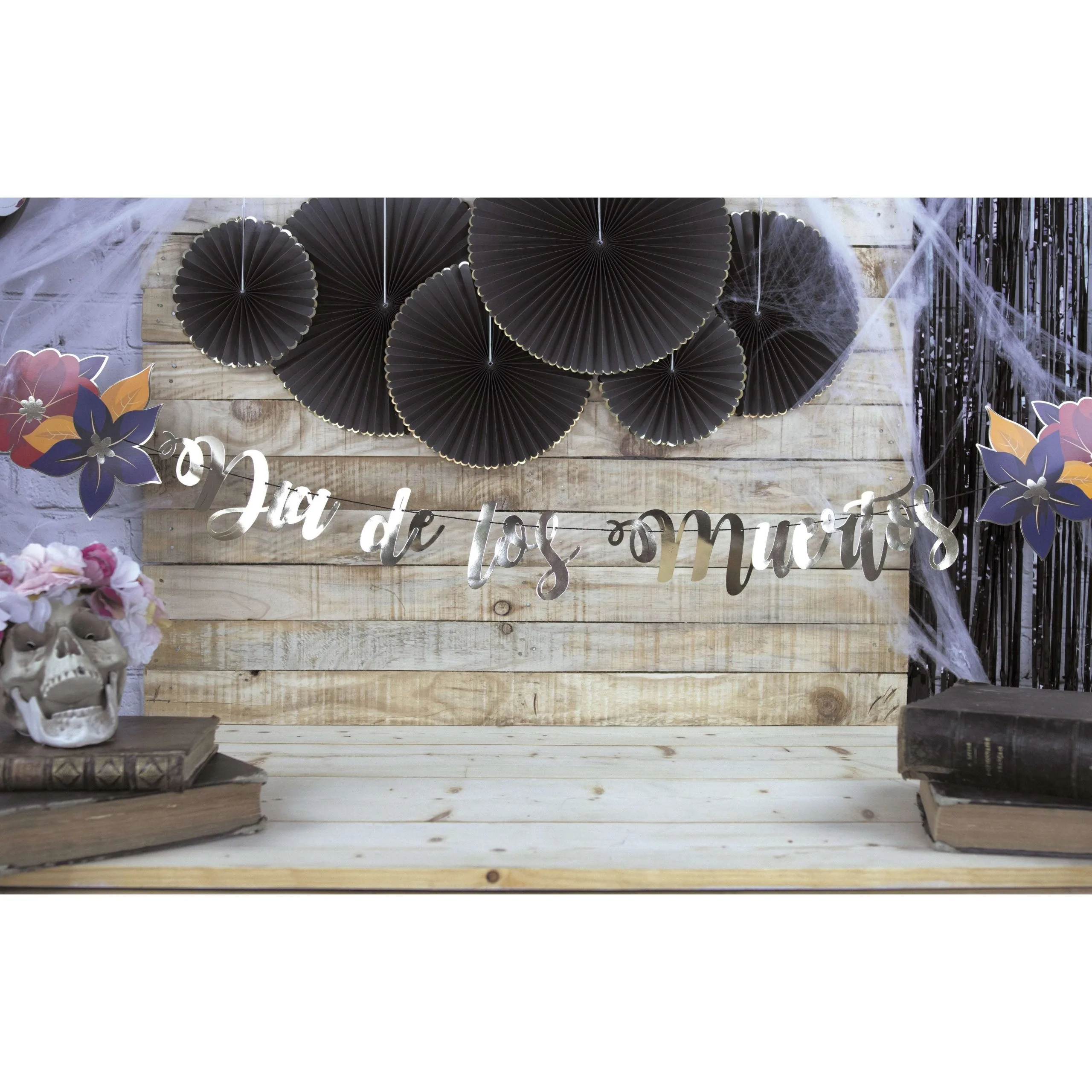 Cette guirlande “lettres” en carton mesure 2 mètres de long. Elle se compose des mots “Dia de los muertos” et chaque lettre, de couleur dorée, mesure 24,5 cm.