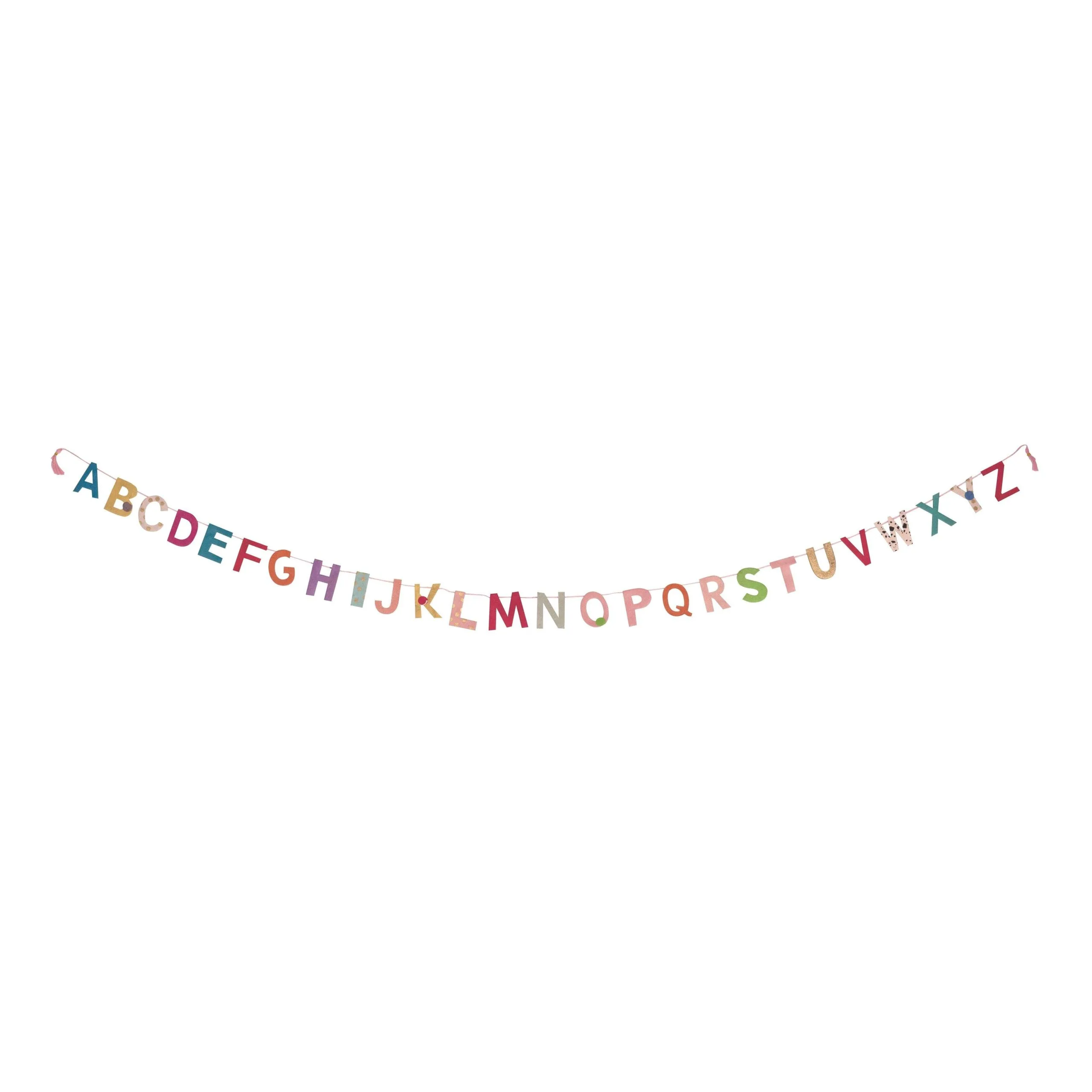 Cette guirlande en lokta multicolores mesure 1,80 mètres de long. Elle se compose des lettres de l’alphabet.