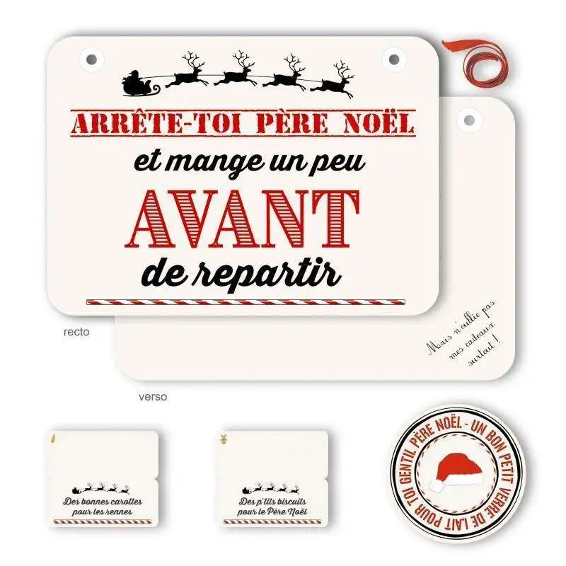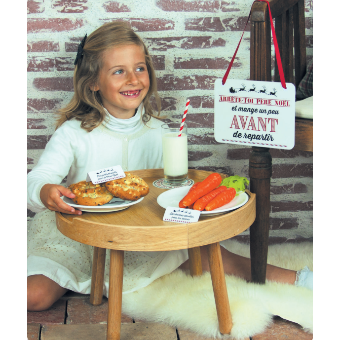 Ce kit de bienvenu pour le Père Noël se compose d’une pancarte, de 2 petits panneaux pour les carottes des rennes et les biscuits à grignoter, et d’un dessous de verre pour le lait !