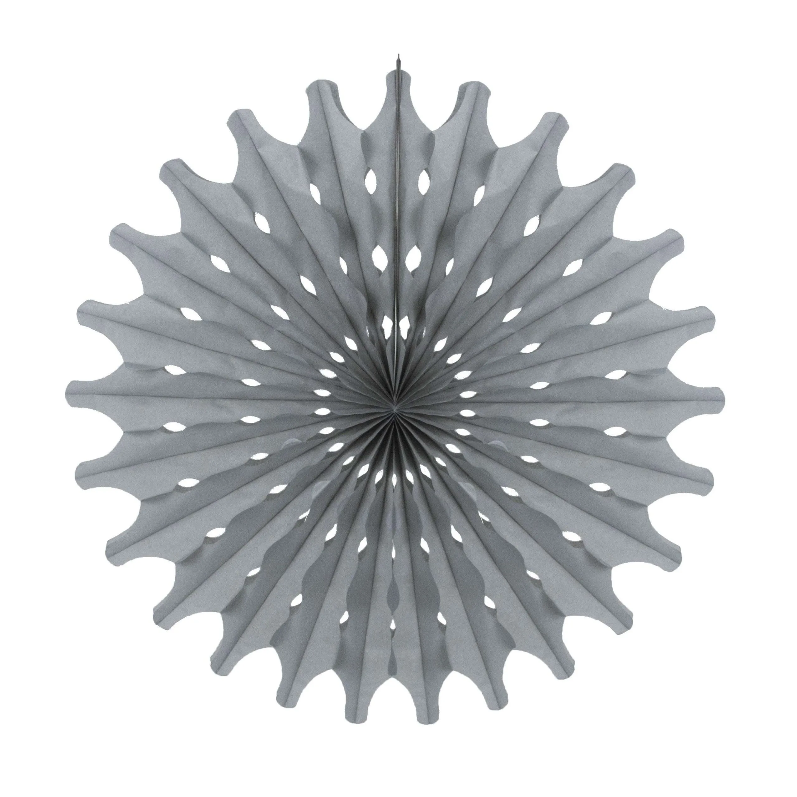 Cet éventail ajouré gris en papier mesure 20 cm de diamètre.