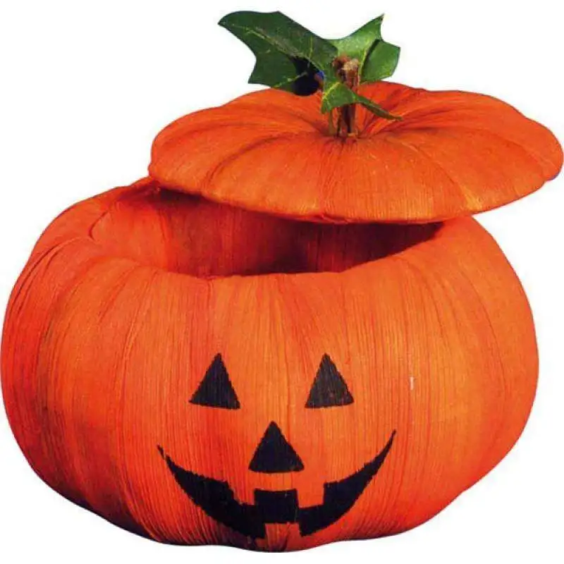 En polystyrène, il est recouvert de papier crépon orange. Un visage de citrouille est peint en noir. Des feuilles sont présentes sur le couvercle.