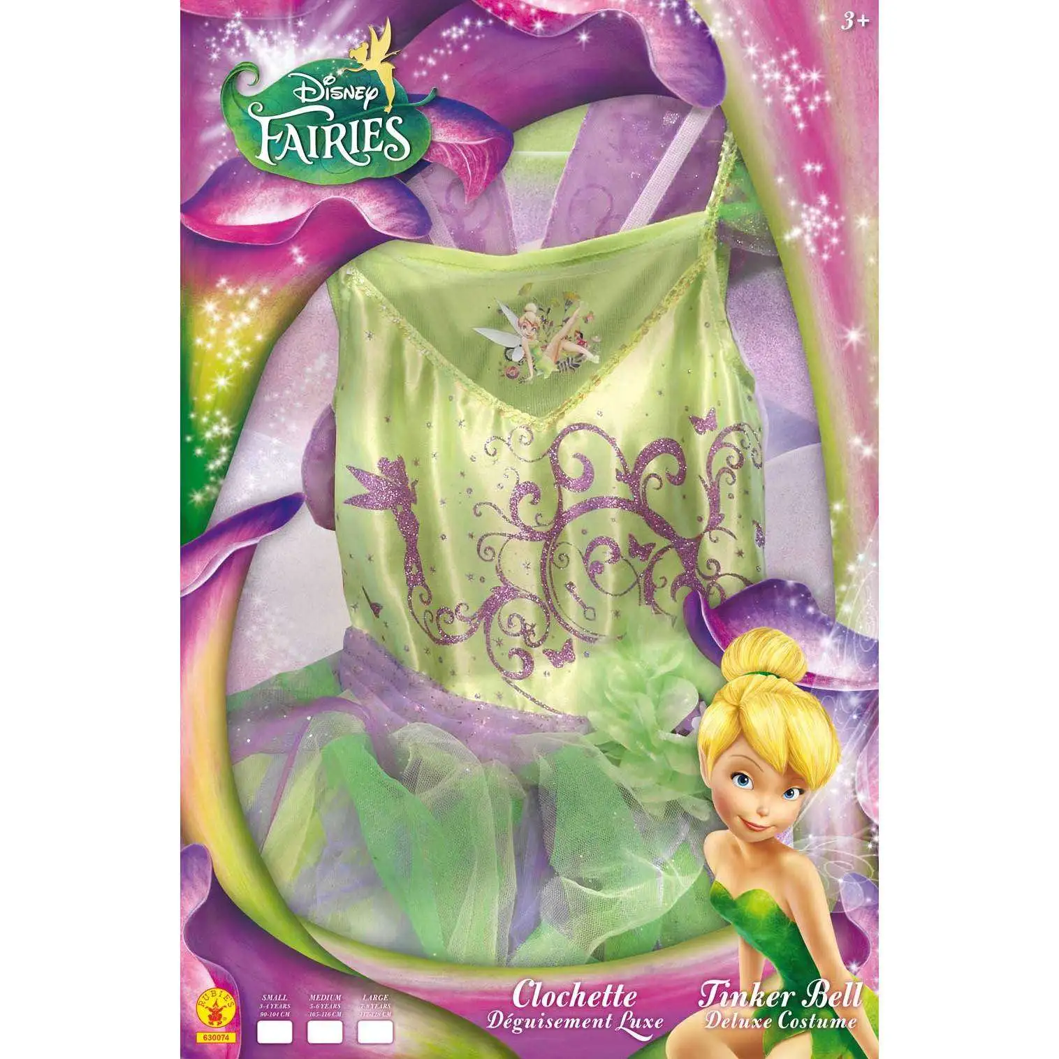 La robe est en tissu vert satiné, à l’effigie de la Fée Clochette. Le buste est recouvert de motifs à paillettes rose. Une ceinture de tulle violet, décorée d’une fleur, est cousue à la taille.