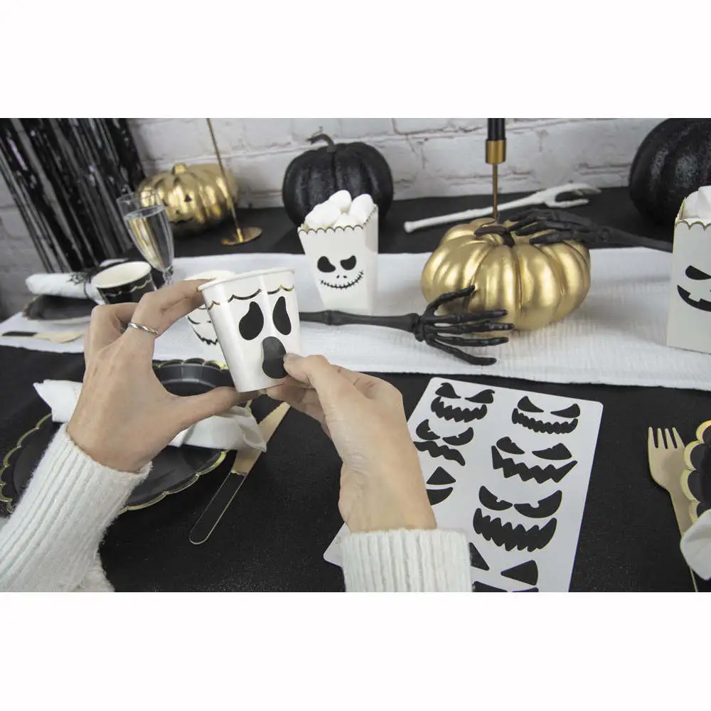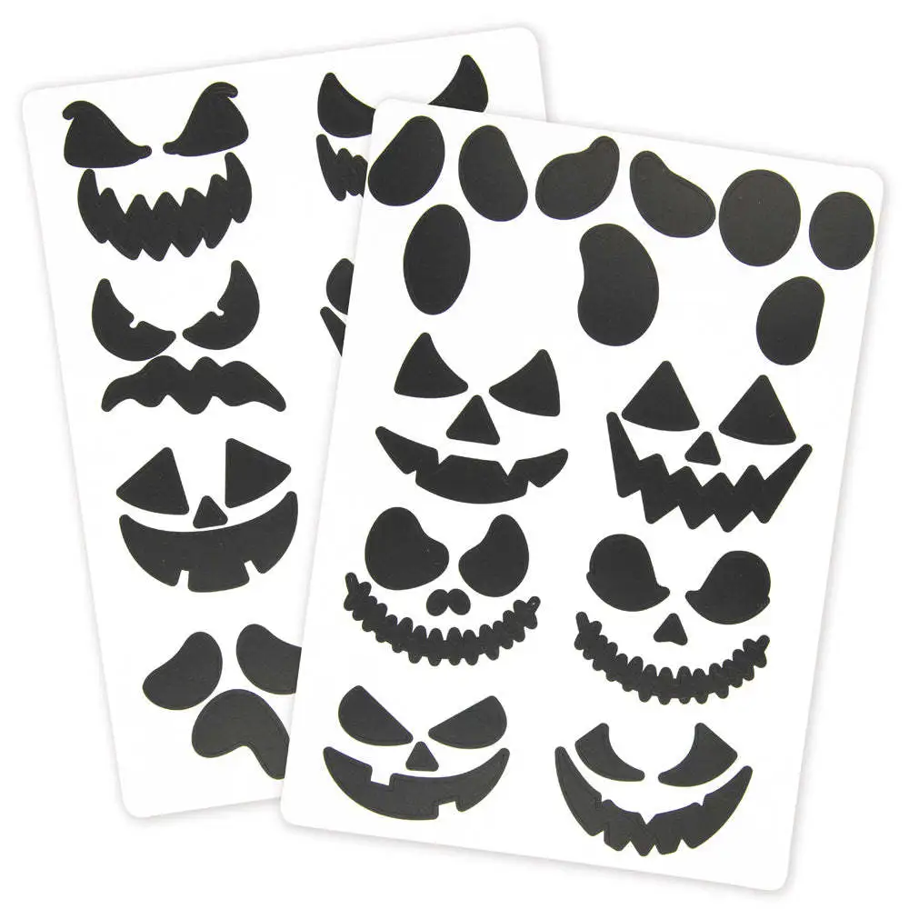 Ces planches contiennent 17 autocollants représentant des visages effrayants d’Halloween.