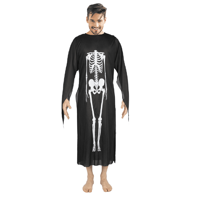 Ce déguisement de squelette pour adultes contient une robe de 120 cm de long. Il est disponible en taille unique.