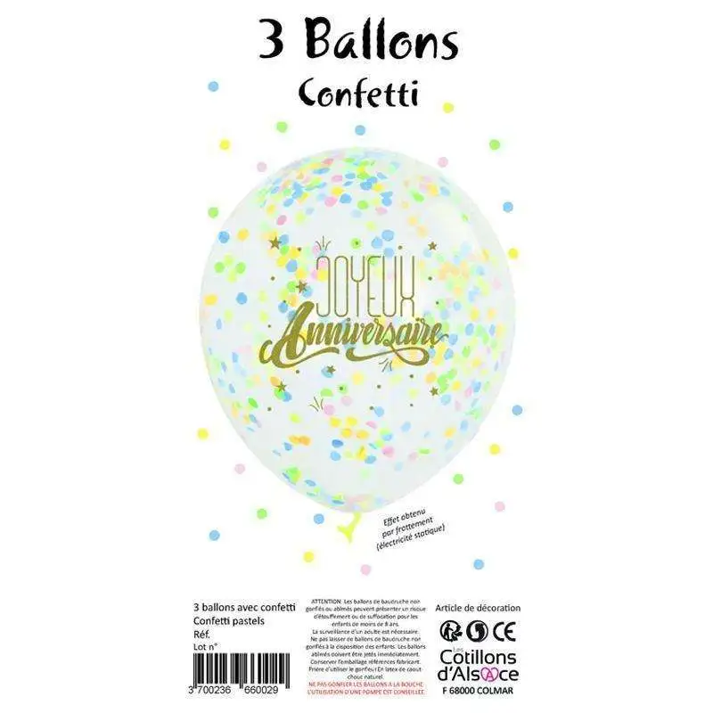 SACHET 3 BALLONS JOYEUX ANNIVERSAIRE CONFETTIS PASTEL