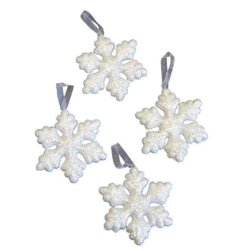 Ce lot de 4 flocons de neige blancs irisés mesurant 11,50 centimètres de diamètre sera parfait pour finaliser votre décoration de noël.