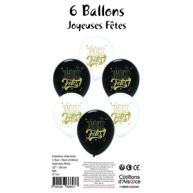 SACHET DE 6 BALLONS “JOYEUSES FÊTES” NOIR ET BLANC