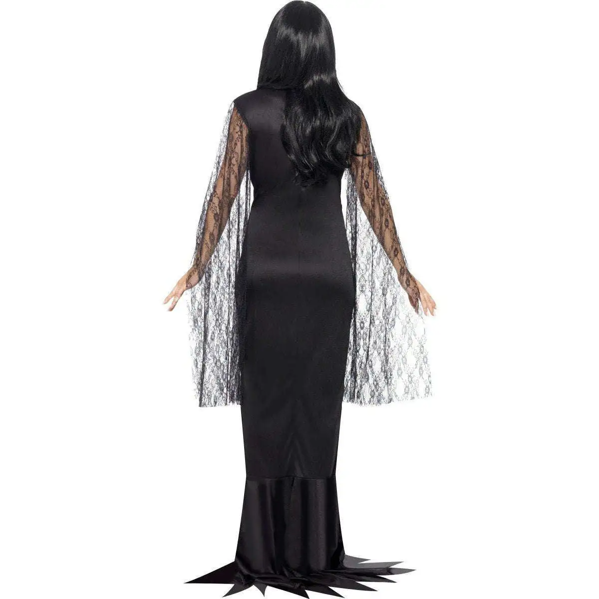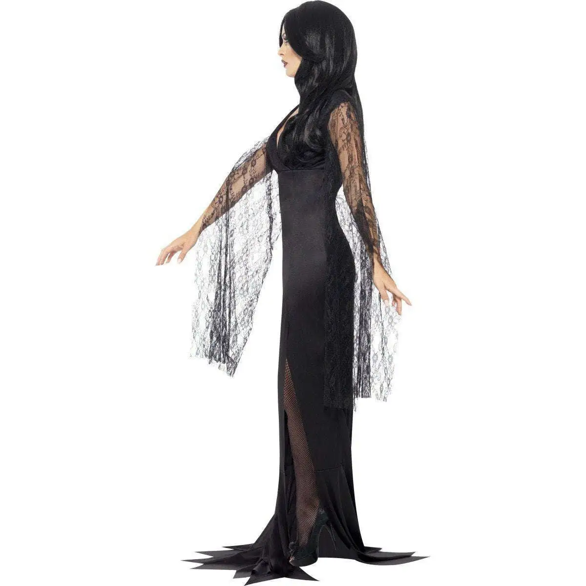 Cette longue robe noire repose sur un style gothique, sorcière, vampire, le bas de la robe se termine par un effet découpé, elle est ouverte sur un côté. Les longues manches drapées sont en dentelles dans le style des personnages sombres.