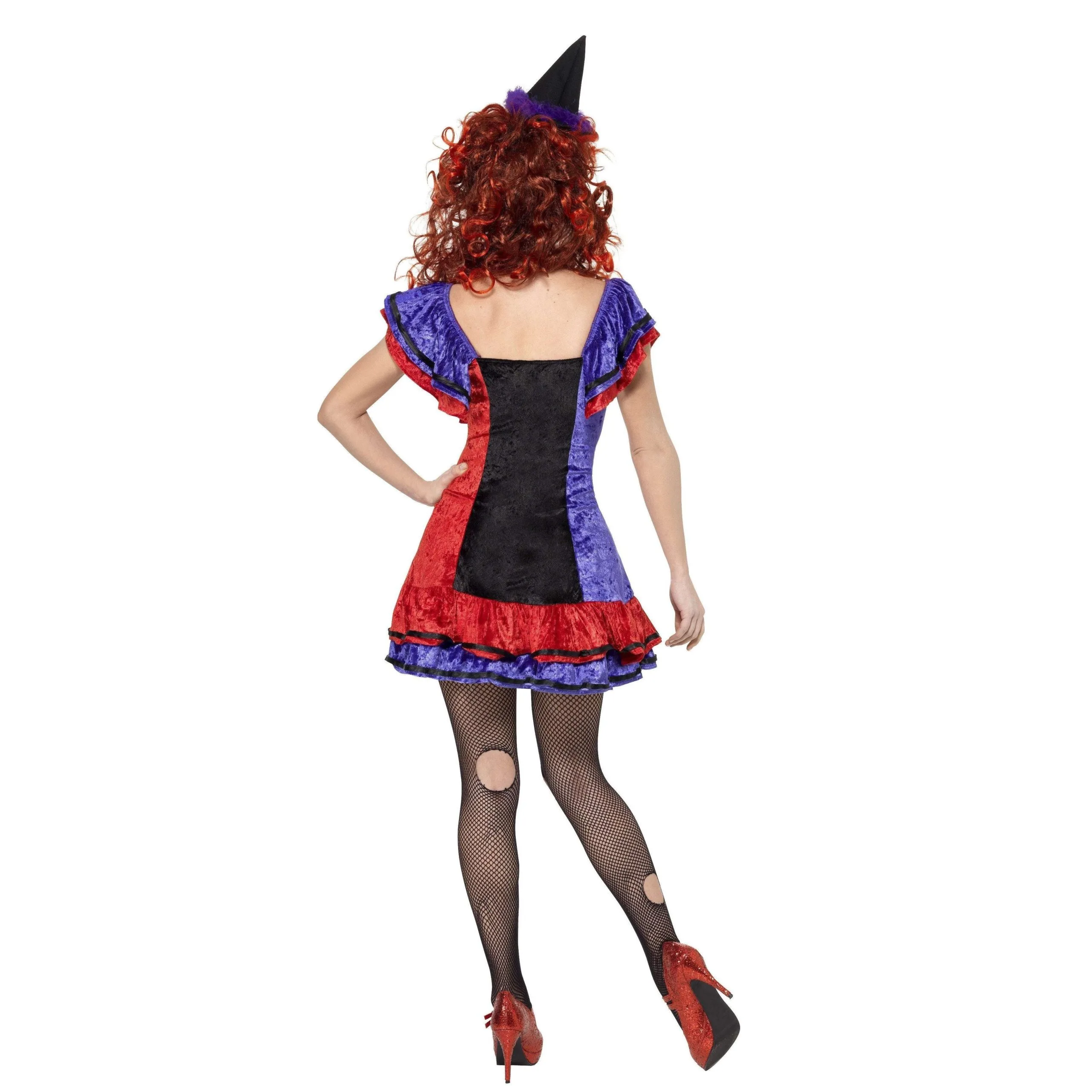 Ce déguisement de clown pour femme comprend une robe et un serre-tête. Disponible en taille S ou M.