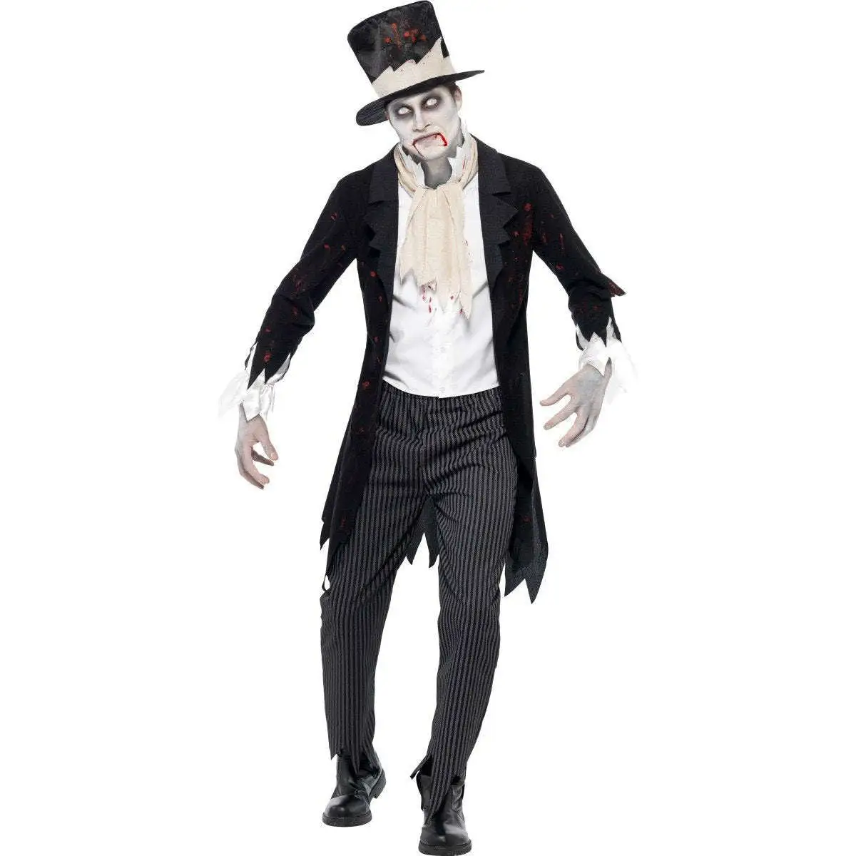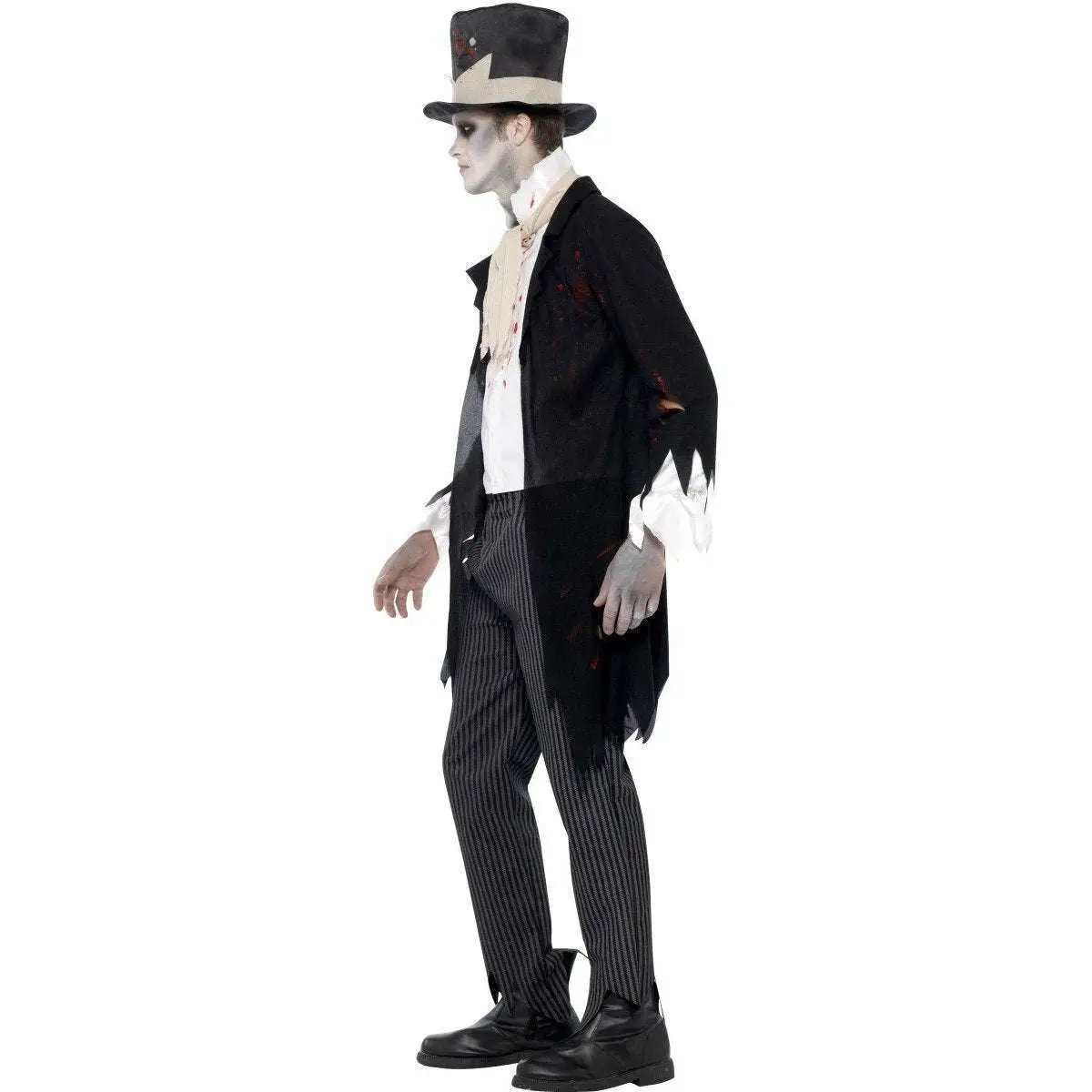 La veste noir en tissu polyester ressemble à une queue de pie arraché, ellle est constituée de manches longues finissant déchiré, l’ensemble de est couvert de tâches de sang. Le gilet blanc se fixe par lanières au dos, et velcro au cou, il est également recouvert de tâches de sang. La cravate type mariage se fixe par velcro. La pantalon rayé gris et noir possède un élastique, il est arraché en bas. Le chapeau haut de forme noir est couvert de tâches de sang.