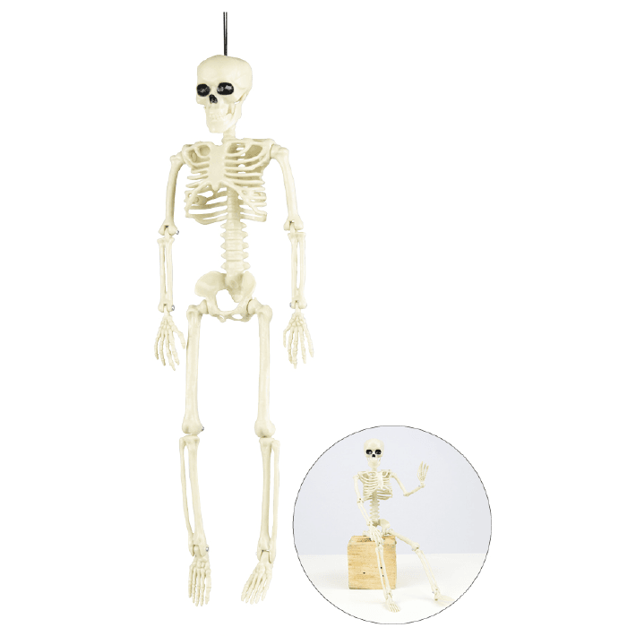 Ce squelette blanc est à poser ou à suspendre grâce à un cordon fixé sur la tête. Il mesure 40 cm de hauteur.