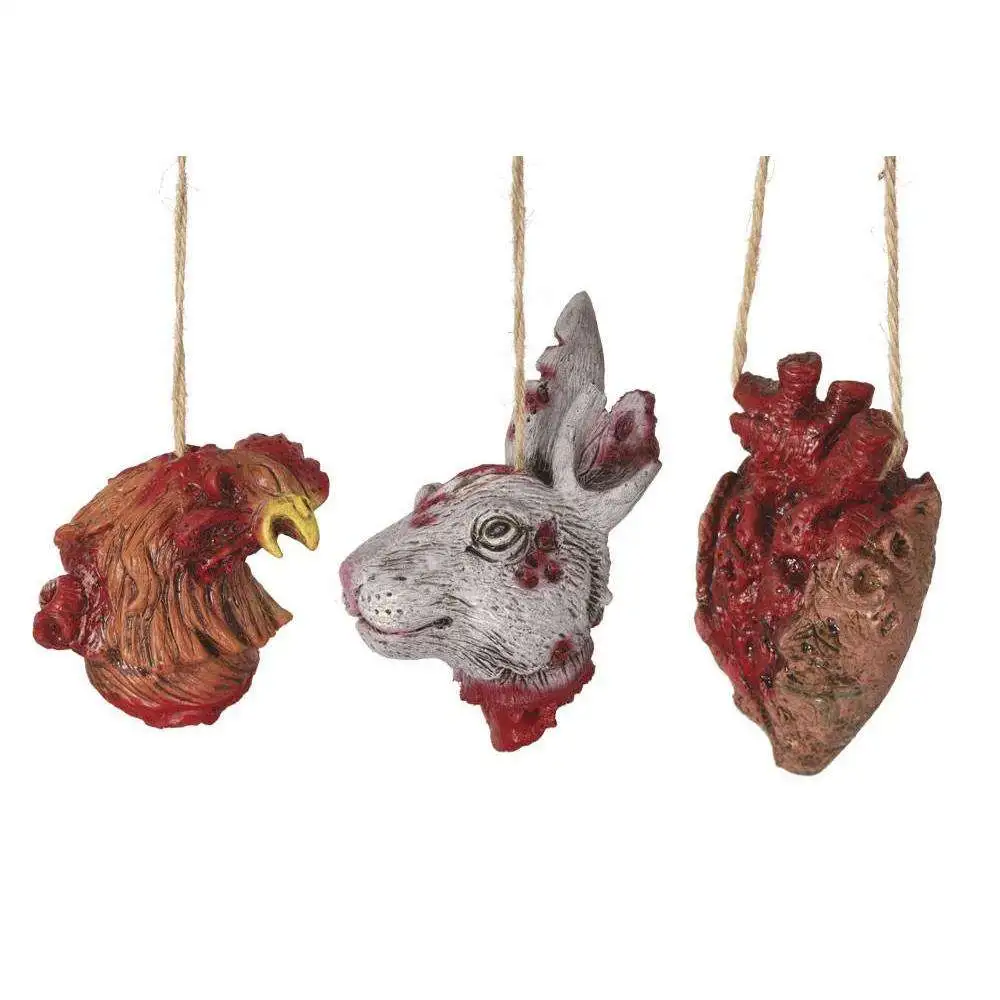 Cette suspension en latex représente des têtes de coq ou de lapin, ou encore un coeur sanglant.