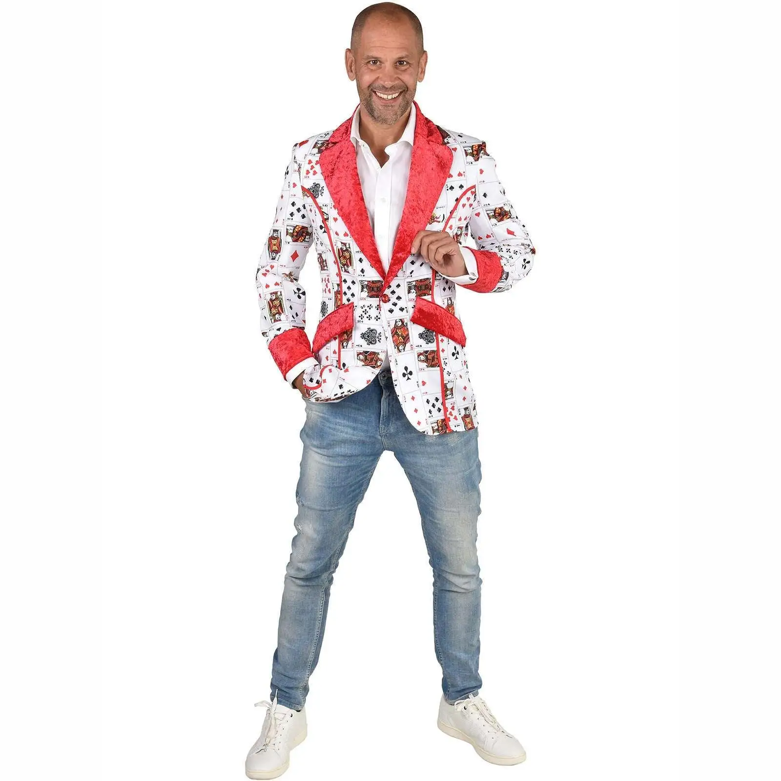 Cette veste “Jeu de cartes” pour hommes existe en tailles XS, S, M, L, XL et XXL.